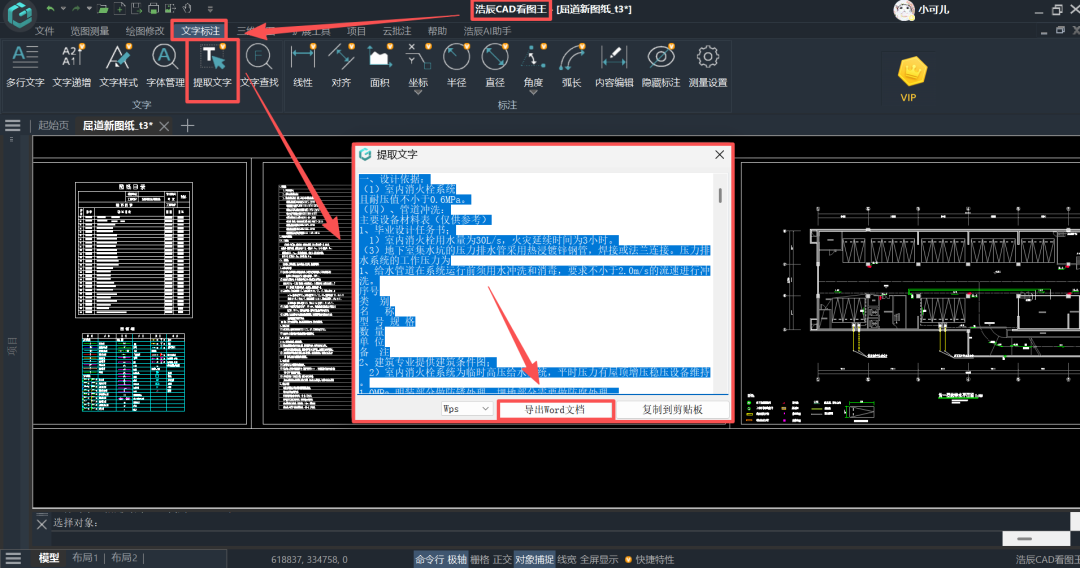 浩辰CAD看图王电脑版的「提取文字导出Word」功能,能够一键识别并提取DWG/DXF图纸中的所有文字信息(如图纸说明、技术要求、材料清单等),并直接导出为可编辑的Word文档。