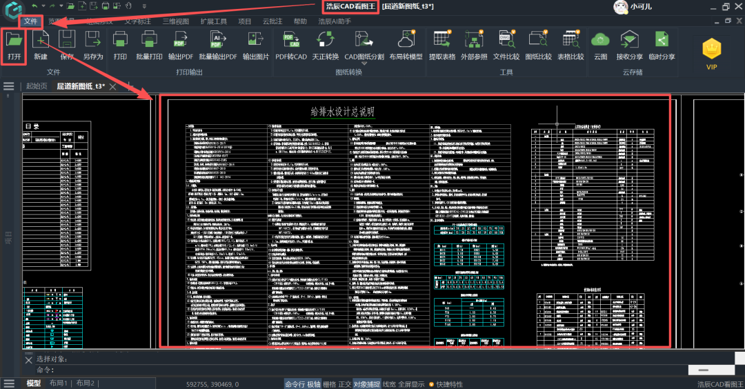 1、在浩辰CAD看图王电脑版中点击【文件】菜单栏的【打开】或者直接点击起始页上的【打开图纸/模型】选择要打开的CAD图纸,如果之前打开过,则该图纸模型会出现在起始页的缩略图中,直接点击即可打开,如下图所示,我们打开的CAD图纸中可以看到有大量的文字内容;