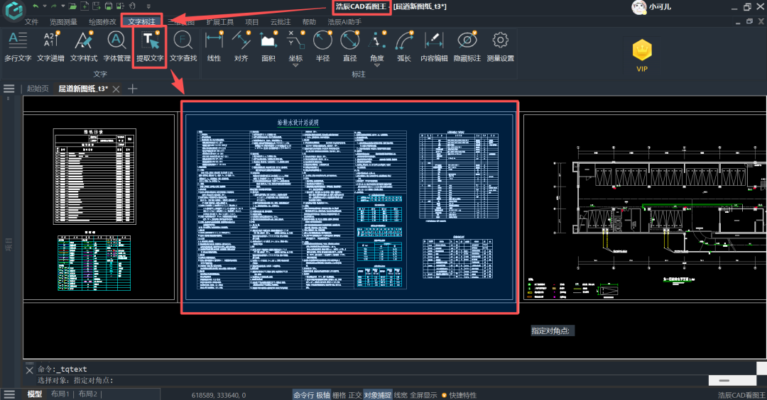 2、在【文字标注】菜单栏点击【提取文字】功能,并在CAD图纸中框选需要导出文字的部分,如下图所示;